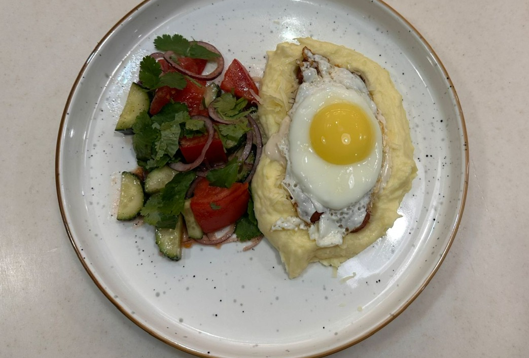 Пюре, сыр пармезан, сливки, сосиски, помидоры, огурцы, капуста пекинская, яйцо, листья салата, лук, зелень.