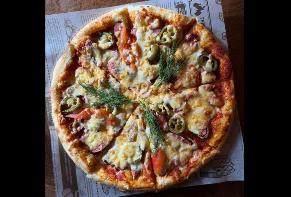 Сыр моцарелла, креветки , семга, мидии, сливочный соус Том ям. Лук зеленый